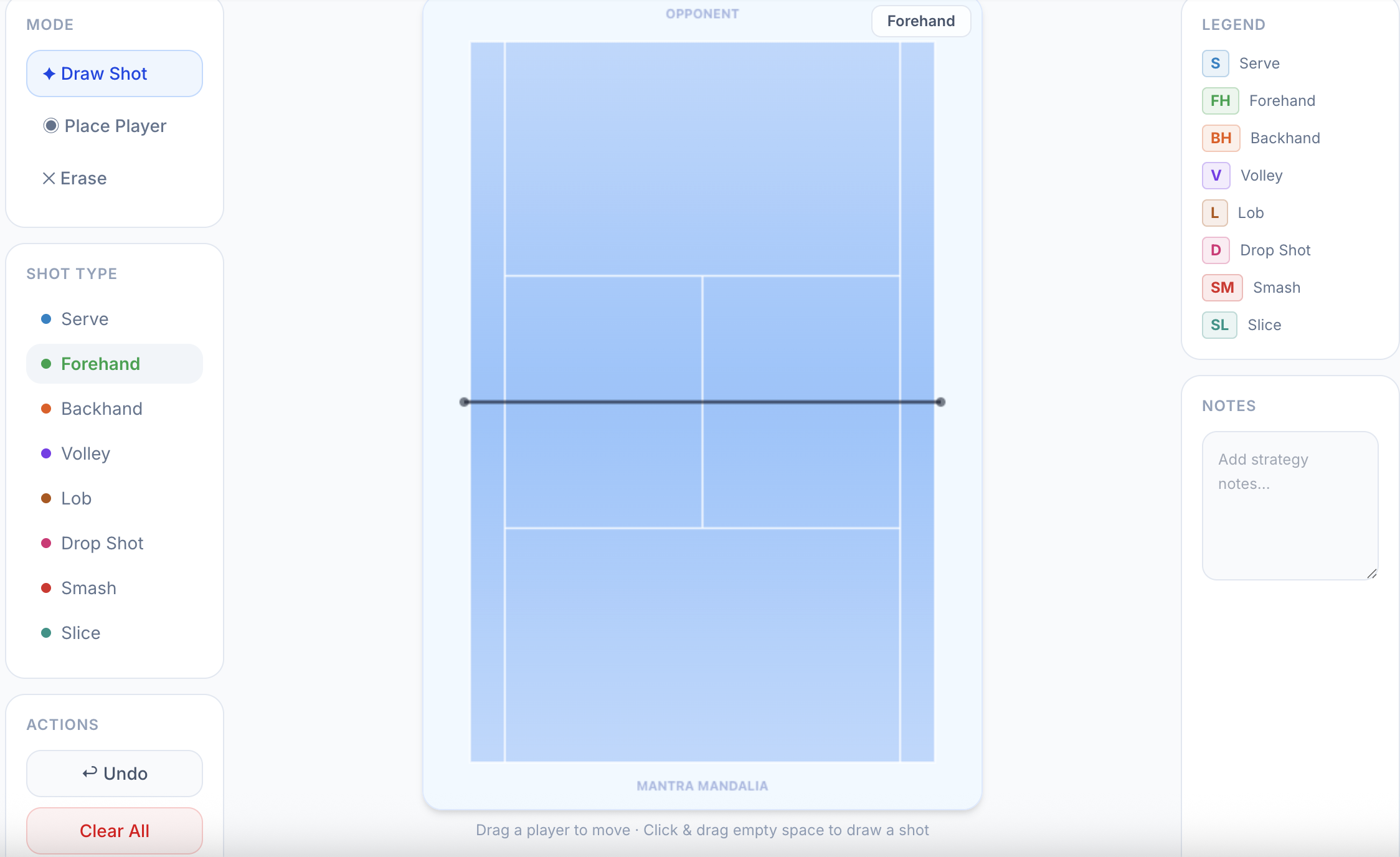 To draw a shot, select Draw Shot mode, pick the shot type, then click and drag from the starting position to where you want the ball to land. An arrow appears with the shot label at its midpoint.